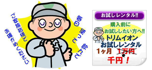| ●1ヶ月経過後トリムイオンのご購入を希望される場合 あらためて新品の商品をお送りし、取り付け業者が機器交換のためお伺いいたします。ご購入代金から1ヶ月分のレンタル料1,000円を差し引かせて頂きます。 |